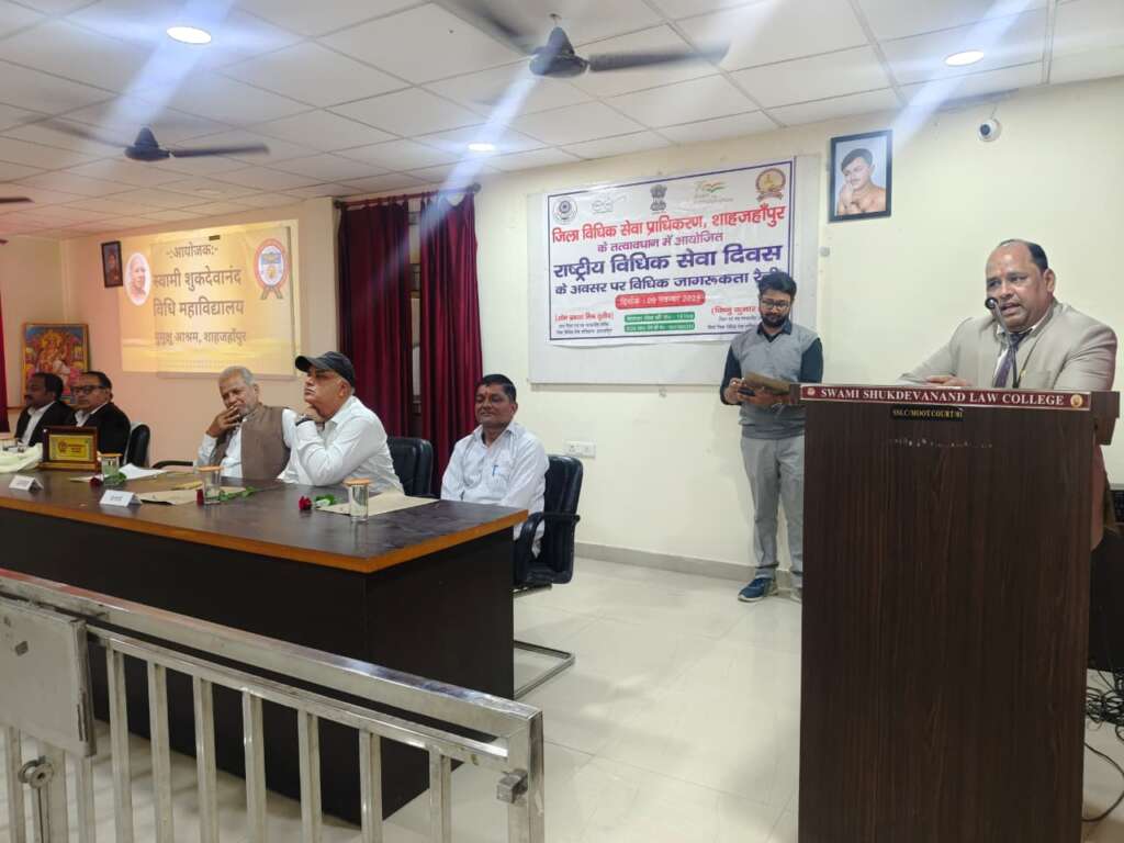 शाहजहाँपुर। राष्ट्रीय विधिक सेवा दिवस के अवसर पर स्वामी शुकदेवानंद विधि महाविद्यालय में विधिक जागरूकता रैली एवं संगोष्ठी का आयोजन किया गया। यह कार्यक्रम जिला विधिक सेवा प्राधिकरण, शाहजहाँपुर के तत्वावधान में संपन्न हुआ।